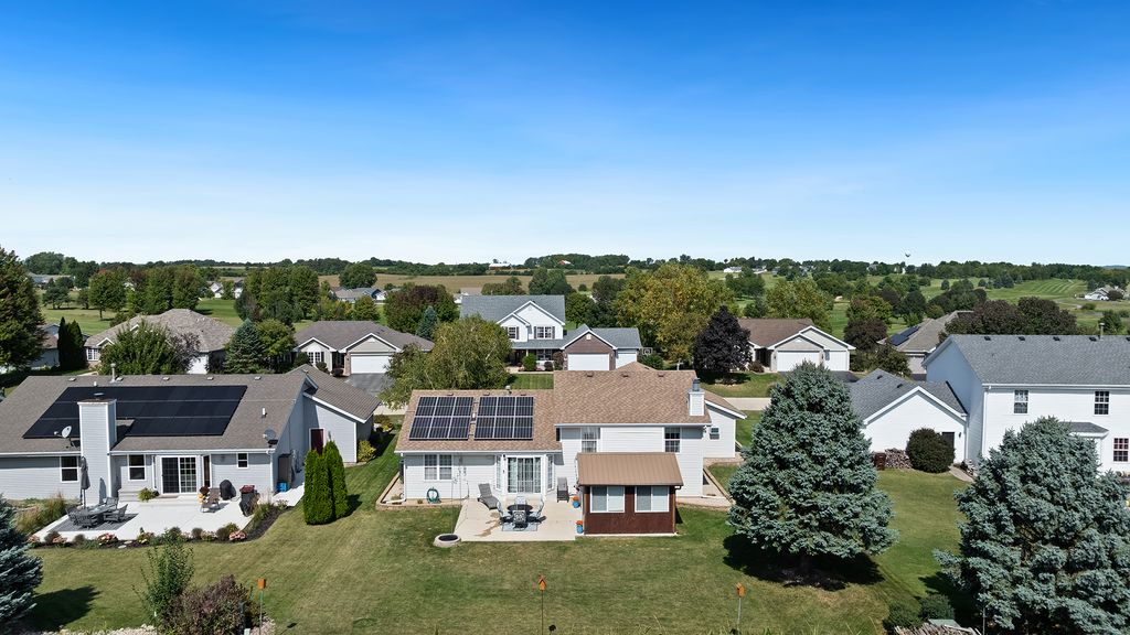 Welcome to this beautiful tri-level home in a vibrant lake community offering fishing, boating, tennis, basketball, and golf. The main level features an inviting living room, dining area, and kitchen. Upstairs you'll find three spacious bedrooms and two full bathrooms. The lower level includes a cozy family room with a corner gas fireplace, a fourth bedroom, and another full bathroom - perfect for guests or extra living space. Enjoy outdoor living on the covered front porch and updated patio (4 years old). The attached 3-car garage includes a heated and conditioned single bay plus an insulated double bay. Updates include, plank flooring (3/4 years), new carpeting. The furnace is a high efficient unit, and the AC is also a high-efficiency model. Both were installed in 2022 and come with a 10-year warranty. Water heater (2016), whole-house humidifier, and a new patio door (6/8 months). The driveway was seal coated in 2025, and the sidewalk was replaced just a year ago. Extras include a sump pump, owned water softener, invisible dog fence, owned solar panels, and a relaxing hot tub that stays with the home - now with its own detached hot tub room for year-round enjoyment. Perfect for those who value comfort, recreation, and community living.