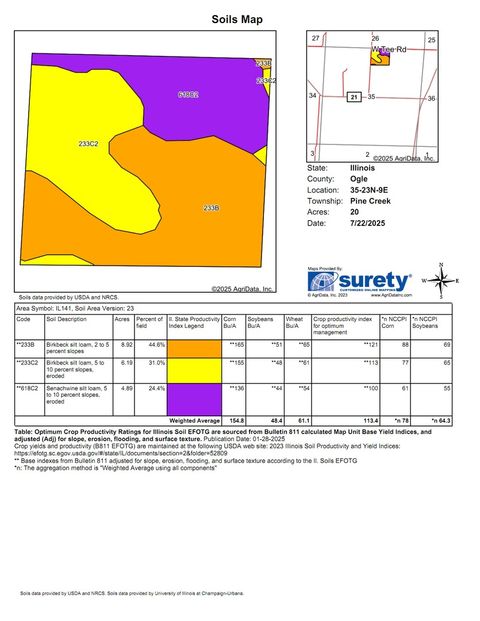 Check out this 20 acre parcel for sale in Pine Creek Twp. This hard to find property offers an opportunity for row crops as well as recreation and was reported to be a buildable parcel according to the Ogle Co. Zoning Office. Lot dimensions shown are approximate. Buyers are encouraged to verify all information prior to making an offer. This parcel is lease free for 2026. Possession is subject to the seller removing the 2025 crop. The PI is 113.4 and the soils are Birkbeck and Senachwine Silt Loam. This parcel is across the road from a 43.31 acre farm that is also listed for sale. See MLS number 12427339 for more information.