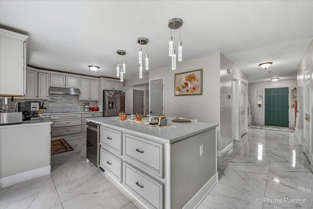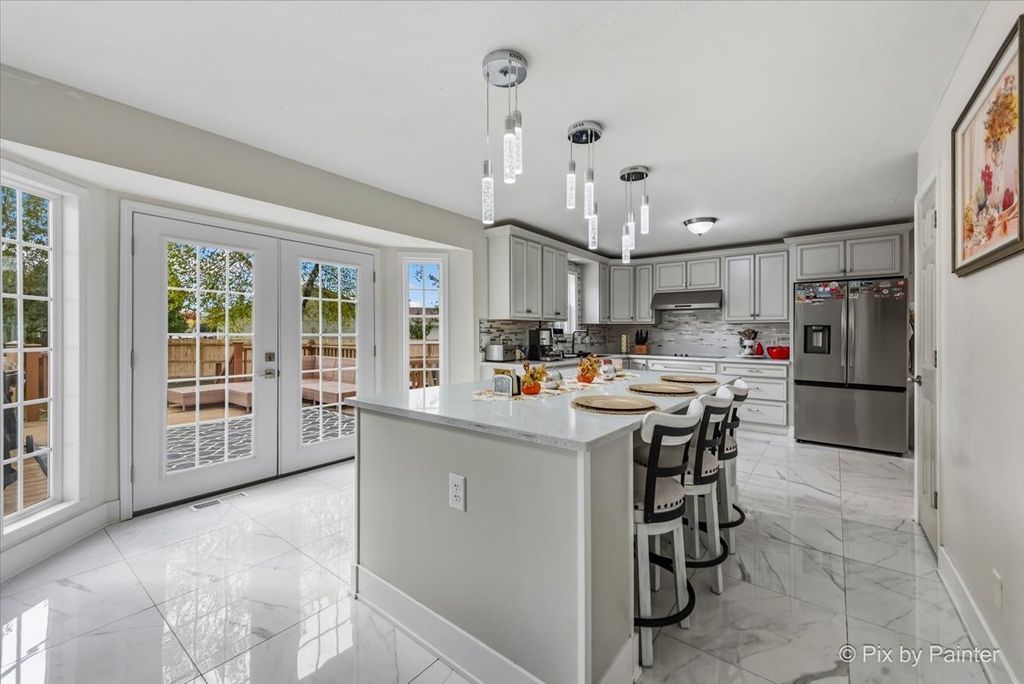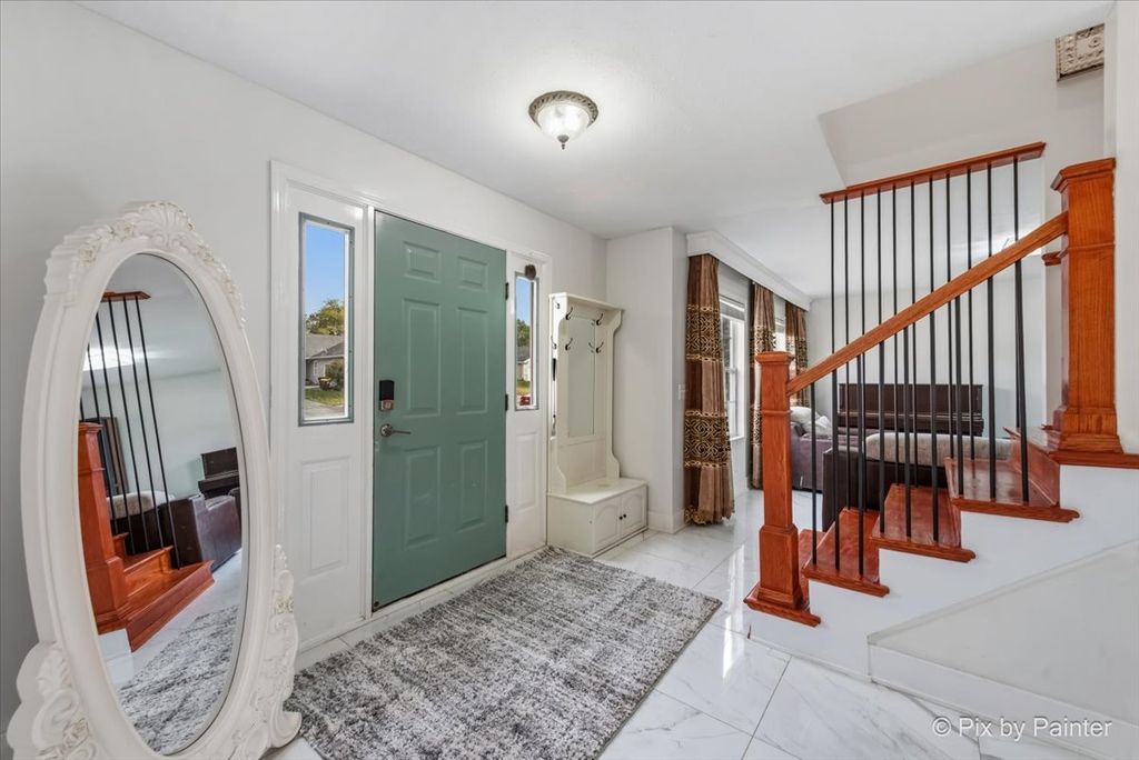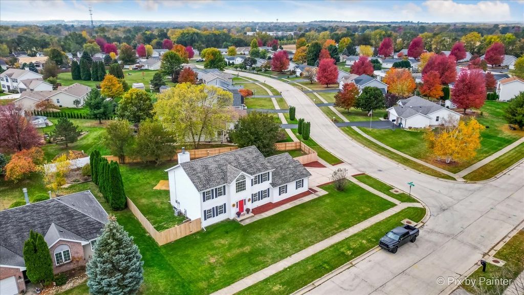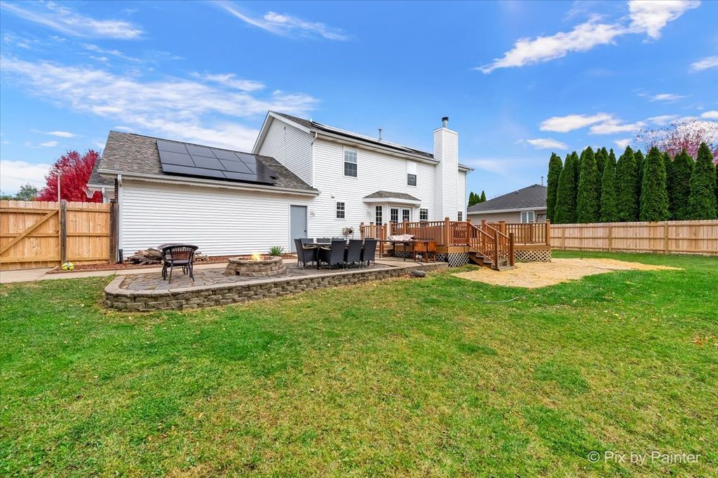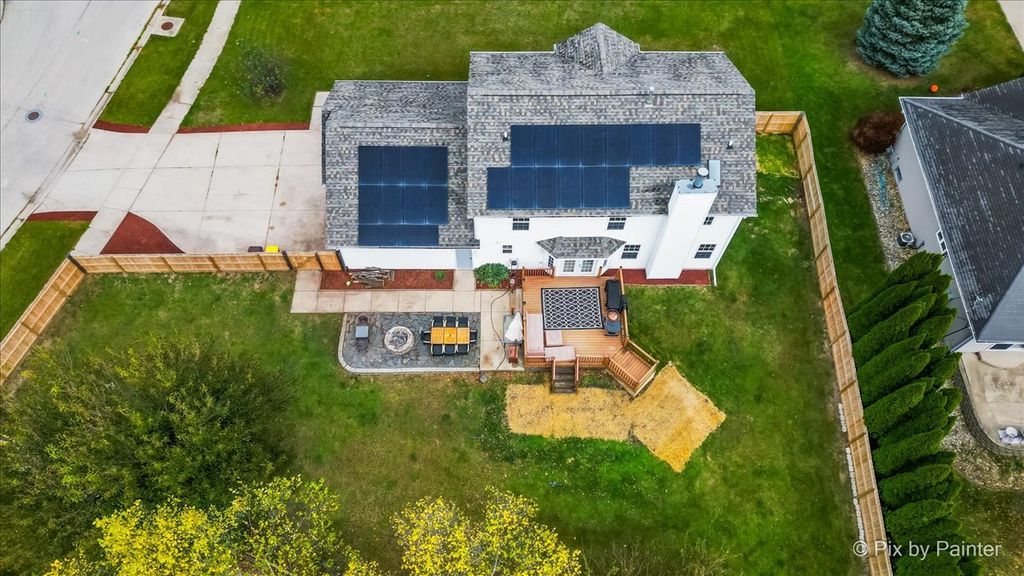 Prepare to be amazed! This stunning 5-bedroom Colonial with over 3,500 sq ft blends timeless elegance with modern luxury! Step inside to a breathtaking open floor plan featuring marble tile throughout the main level, a spacious family room with a wood-burning fireplace, and a designer kitchen that will leave you speechless-completely remodeled with 42" custom cabinets, quartz countertops, high-end stainless steel appliances, a marble backsplash, massive island with breakfast bar, and premium finishes top to bottom. The kitchen also features a brand-new double oven and refrigerator (2024). Upstairs you'll find 4 large bedrooms plus a versatile loft and two full baths, including a serene primary suite. The finished basement offers even more living space with a rec room, wet bar, full bath, office, laundry area, and a fifth bedroom-perfect for guests or extended family. Major updates include owned solar panels (2024), new roof (2023), full privacy fence (2025), fresh interior paint (2025), HVAC & water heater (2022), and a complete kitchen remodel (2023). Enjoy your private backyard oasis with a deck, patio, and 3.5-car insulated garage. Gorgeous curb appeal, concrete driveway, and a prime location close to I-90, top-rated schools, shopping, and dining. This home checks every box-move-in ready, energy-efficient, and absolutely beautiful inside and out! Don't wait-this one won't last!