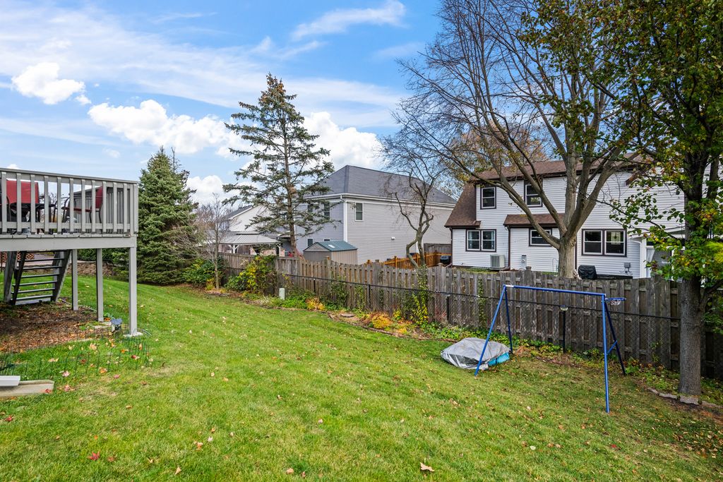Beautiful & Spacious Home in Highly Desired Breton Pointe! Approximately 4,500 sq. ft. of living space including a finished English/look-out basement. Features a 3-car garage, 2 fireplaces, and contemporary styling throughout. Main Level features:Dramatic 2-story foyer, Large living and dining rooms. Dining room includes box bay window. Oversized kitchen with center island, glass backsplash, and separate bay eating area. Kitchen opens to spacious family room with custom built-in cabinetry, fireplace, and patio doors to deck and yard. Large laundry room with exterior access. In-ground sprinkler system Second Level features: Private step-up master suite with vaulted ceilings, newer carpet, corner fireplace, walk-in closet, and luxury bath with dual sinks, Jacuzzi tub, and separate shower. Three additional generously sized bedrooms; two with walk-in closets and laundry chutes. Updated hall bath with vaulted ceiling, skylight, dual custom vanity, and slate flooring. Expansive unfinished English/look-out basement with recreation and game room areas. Huge storage/utility space. This exceptional home offers abundant living space, modern updates, and a prime location within the sought-after Breton Pointe subdivision.